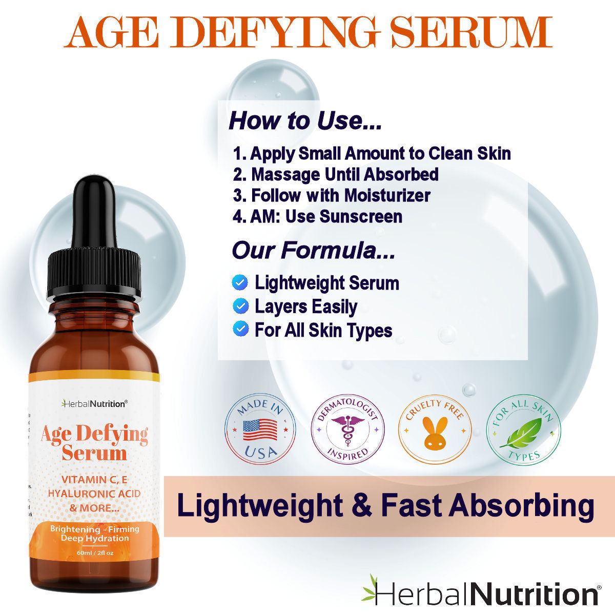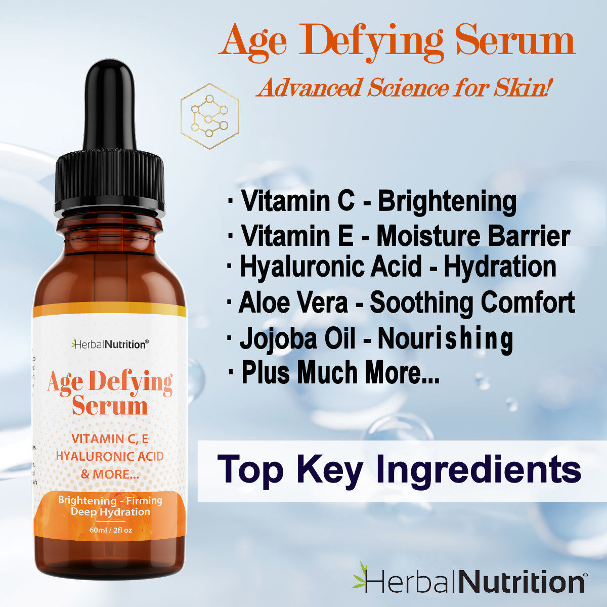 ✨ Age Defying Serum is a refined, lightweight facial serum designed to elevate your daily skincare ritual while supporting smooth, hydrated, radiant-looking skin. This advanced cosmetic formula blends high-performance antioxidants, moisture-binding hydrators, and soothing botanicals to help improve the appearance of skin tone, texture, and overall luminosity. Fast-absorbing and non-greasy, Age Defying Serum layers effortlessly under moisturizer or makeup, leaving skin feeling soft, refreshed, and beautifully balanced – ideal for those seeking a sophisticated, results-focused skincare experience.