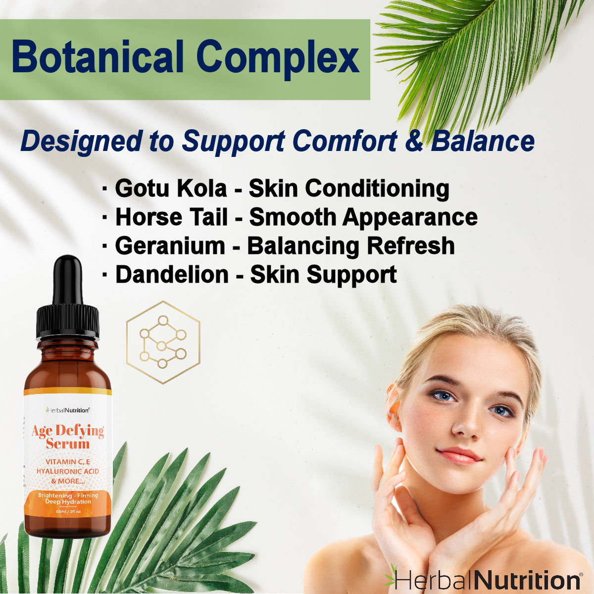 Elevate your skincare routine with Age Defying Serum, a lightweight, fast-absorbing facial serum designed to support hydrated, smooth and radiant-looking skin. This refined cosmetic formula combines Vitamin C, Vitamin E, Hyaluronic Acid, and a blend of botanical extracts and oils to nourish and refresh the appearance of your complexion. Ideal for daily use, Age Defying Serum layers seamlessly under moisturizer or makeup, offering a premium, luxurious experience while supporting the appearance of healthy, vibrant skin.