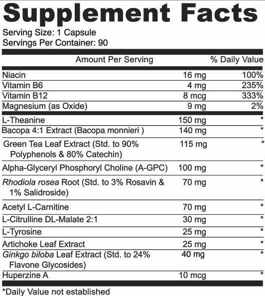 KEY INGREDIENTS – Huperzine, Ginkgo, Bacopa, Acetyl L-Carnitine, Rhodiola Root, L-Theanine all support enhanced cognition, memory, and promote better blood flow and oxygen to the brain.* Magnesium Oxide helps balance the brain, relieve stress and enhance mood.* L-Theanine works with Green Tea Extract to provide non-jittery mental stimulation to promote energy and focus.* To learn more about each of our brain boosting ingredients See 15 Reasons to try NeuroShield on our blog.