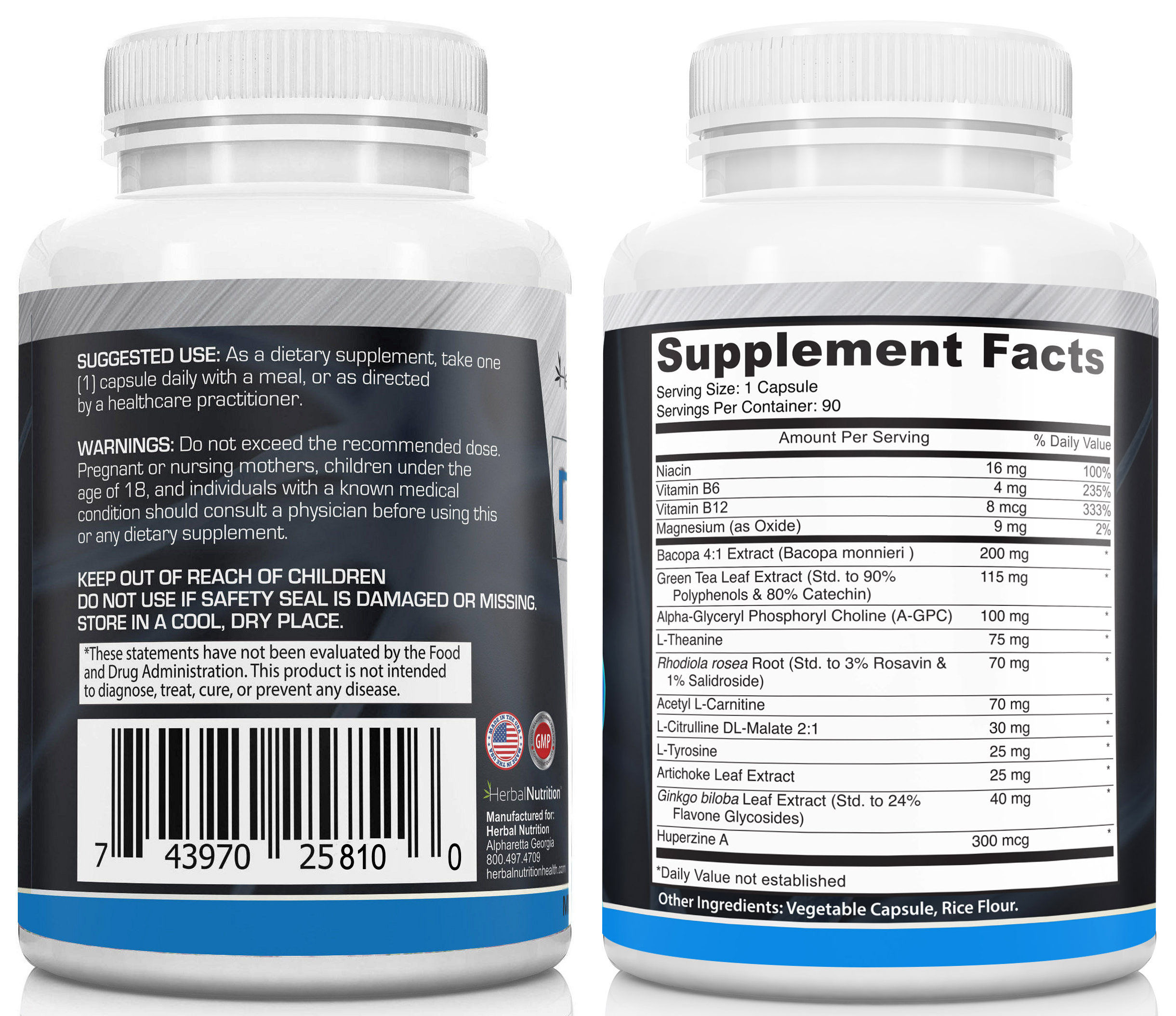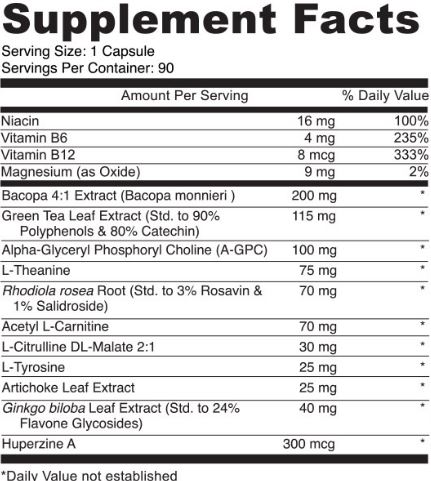 KEY INGREDIENTS – Huperzine, Ginkgo, Bacopa, Acetyl L-Carnitine, Rhodiola Root, L-Theanine all support enhanced cognition, memory, and promote better blood flow and oxygen to the brain.* Magnesium Oxide helps balance the brain, relieve stress and enhance mood.* L-Theanine works with Green Tea Extract to provide non-jittery mental stimulation to promote energy and focus.* To learn more about each of our brain boosting ingredients See 15 Reasons to try NeuroShield on our blog.