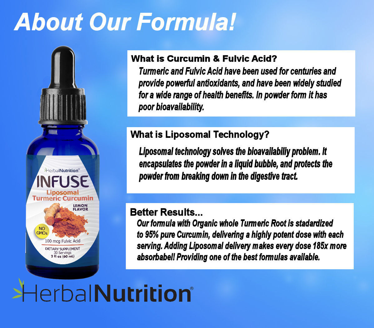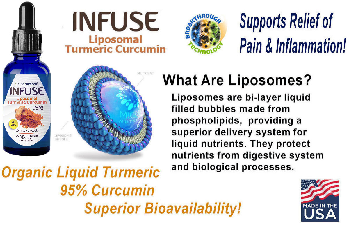 InFuse™ Liposomal Curcumin is 10 times more absorbable than powder turmeric / capsules. Our Liposomal Delivery protects the turmeric extract from breakdown in the digestive tract, delivering a powerful, soothing dose right where you need it. At 10x the efficacy of capsules our minimal dose maximizes results and minimizes potential side effects! Delivers the equivalence of 1000mg of Curcuminoid.