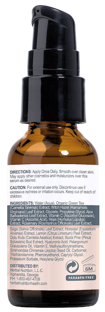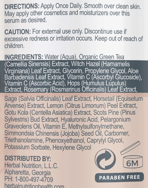 Ingredients: Organic Green Tea (Camellia Sinensis) Extract, Witch Hazel (Hamamelis Virginiana) Leaf Extract, Glycerin. Propylene Glycol, Aloe Barbadensis Leaf Extract, Vitamin C (Absorbyl Glucoside), Vitamin C (Absorbic Acid), Hops (Humulus Lupulus) Extract, Rosemary (Rosmarinus Officinalis) Leaf Extract, Sage (salvia Officinalis) Leaf Extract, Horsetail (Equisetum Arvense) Extract, Lemon (Citrus Limonum) Peel Extract, Gotu Kola (Centella Asiatica) Extract, Scots Pine (pinus Sylvertris) Bud Extract, Hyaluronic Acid, Perlargonium Graveolens Oil, Vitamin E, Methlsulfonylmethane, Simmondsia Chinensis (Jajoba) Seed Oil, Carbomer, Triethanolamine, Phenoxyethanol, Caprylyl Glycol, Potassium Sorbate, Hexylene Glycol